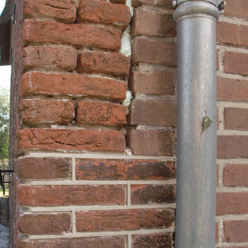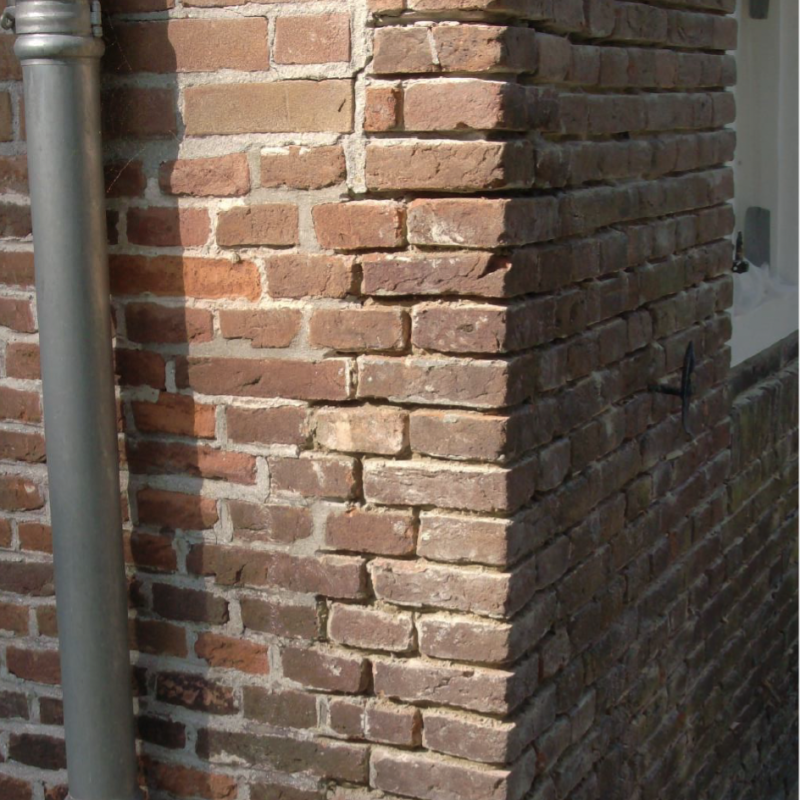 Het betreft hier de voorgevel van een monumentaal pand. Hier is te zien hoe het metselwerk uitspat door gevolg van verkeerd ankergebruik. De voegen waren zo los over de gevel dat er besloten is alle voeger eruit te halen, scheuren en uitspattend metselwerk te herstellen en daarna opnieuw te voegen. (snijvoeg)